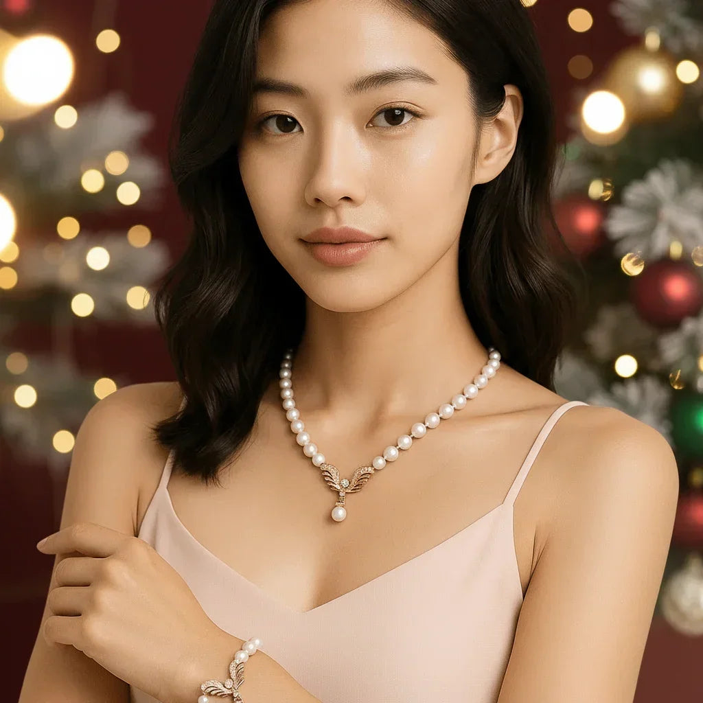 Adorn yourself with the Seraph Pearl Necklace set, a luxurious piece of handcrafted pearl jewellery made with freshwater pearls and a 23k gold-plated setting.